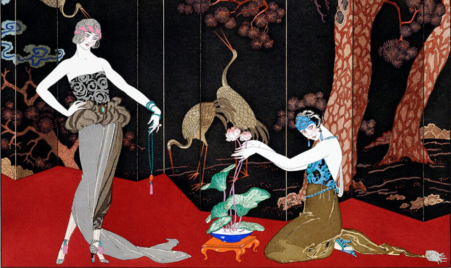 Ilustração de moda de Les Trois Beautes de Mnasidika (1922), por George Barbier. Original da Biblioteca de Livros Raros e Manuscritos Beinecke.