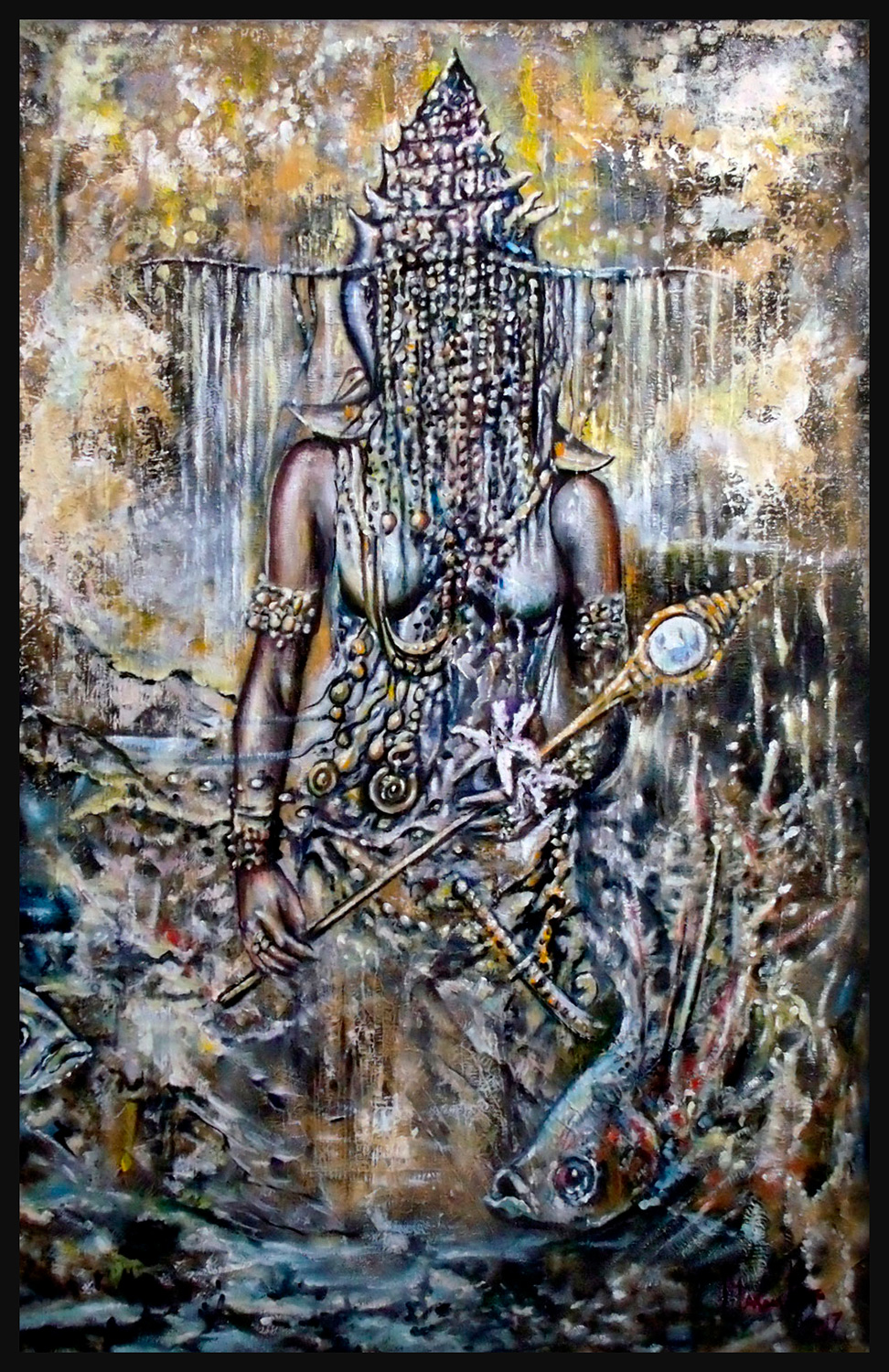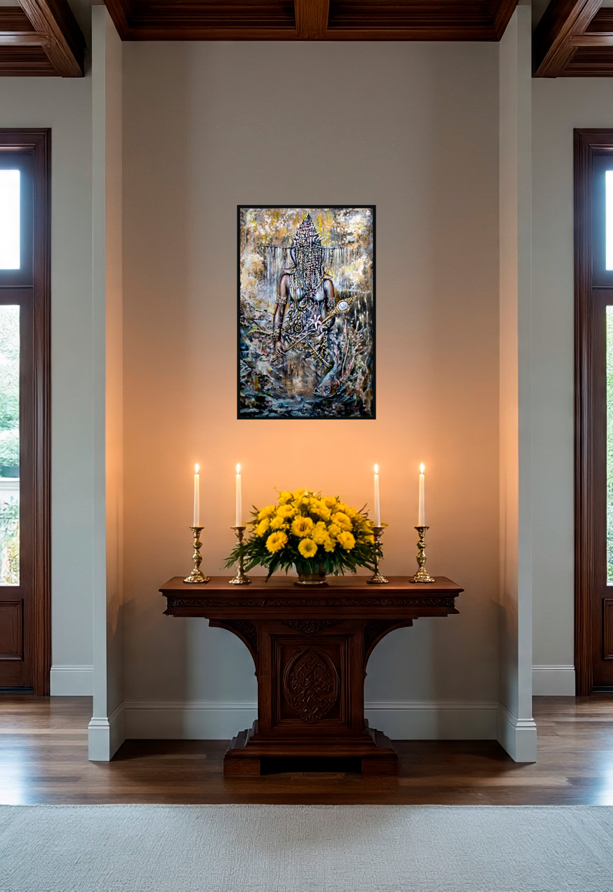 “Òsun Ijùmú”: A divindade das águas doces emerge em tons de ouro e terra, sua coroa adornada com cascatas de búzios e miçangas. Ela segura o espelho de sua sabedoria, refletindo a beleza e a fertilidade que emanam de seu corpo, cercado por peixes e elementos da natureza. A fluidez da água e a solidez da terra se mesclam na tela, celebrando a força e a doçura de Oxum, a orixá do amor, da riqueza e da prosperidade.